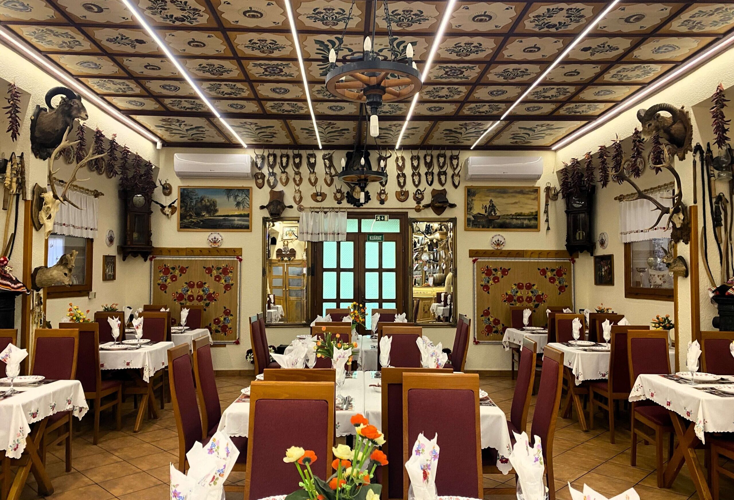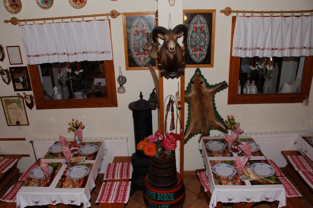 A terem központi eleme a széles pult, amely mögött pincéreink fogadják a vendégeket. A pult és maga a terem is a magyar népművészet motívumaival díszített, így már az első pillanatban átélhető a hazai, családias hangulat.